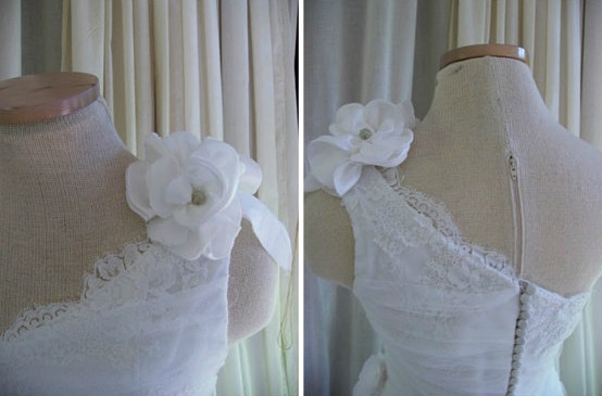 This creation called, ODETTE sports some extraordinary details, thanks to a shirred tulle bodice over cuts of delicate Chantilly lace. Check out the full skirt--cut on the bias donning yards of silks and tulle. Handmade silk florals adorn both the shoulder and waist. This dress can go the casual route as in a woodsy wedding as well as all out formal with the right accessories. . . . .